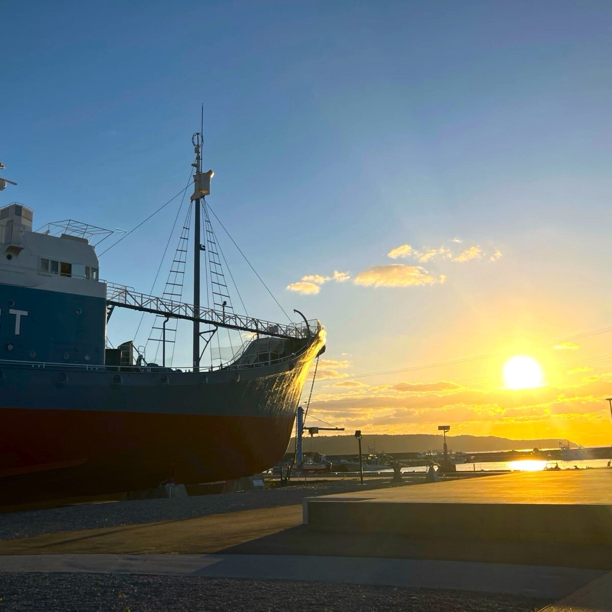 光に透けるグラデーションカラーは鮎川港の四季折々の海の色から着想を受けています。