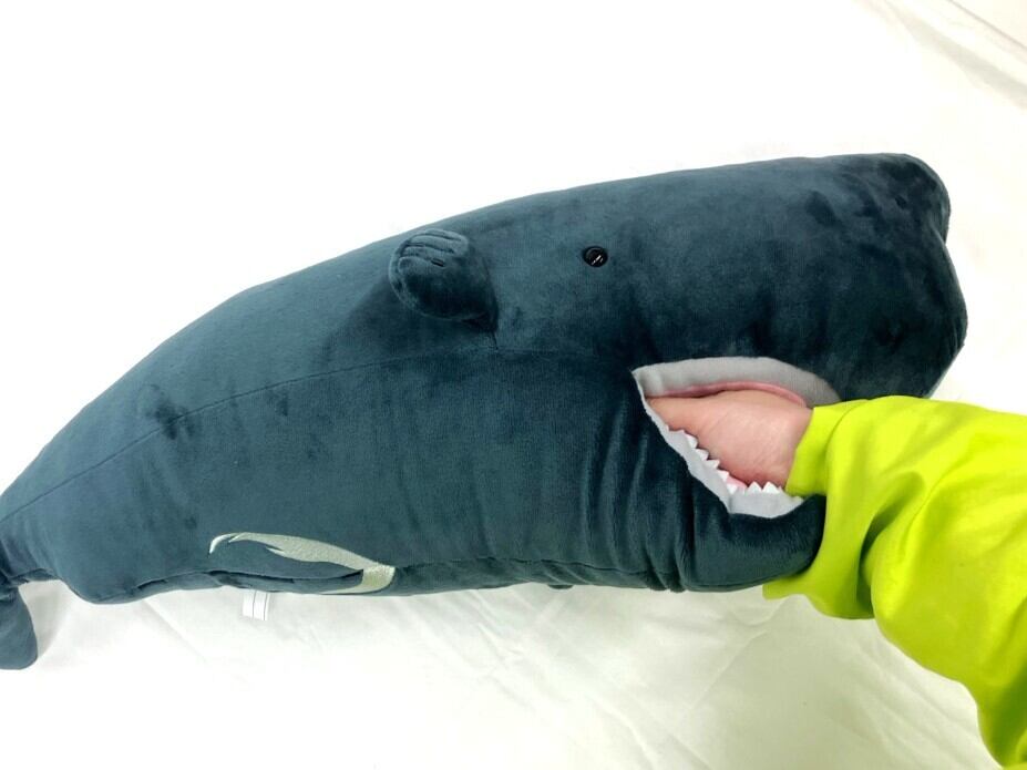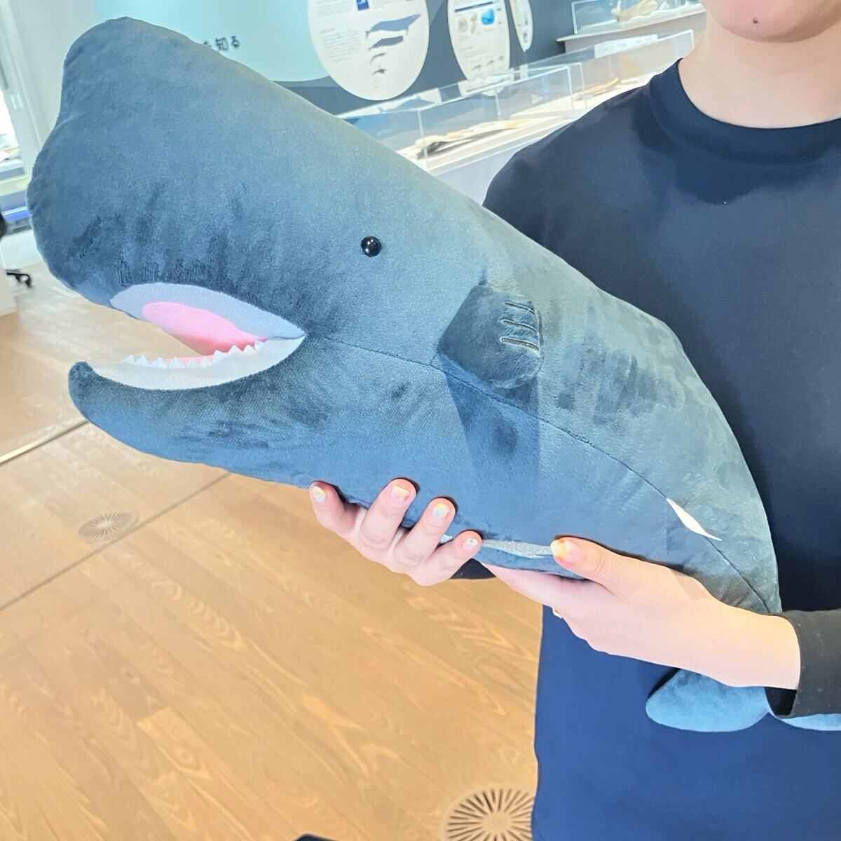 当館学芸員が監修した当館初のオリジナルぬいぐるみです。頭部や尾びれの形、鼻の穴、お腹の模様など何度も修正を重ね、細部にまでこだわりました。マッコウクジラの生物的特徴とぬいぐるみの可愛らしさが融合したホエールランド自信作。50㎝を超える大きさは存在感も抜群で、口の中に手を入れることができる遊び心も詰込みました。学芸員のクジラ愛が詰まったふわふわもちもちのマッコウクジラです。